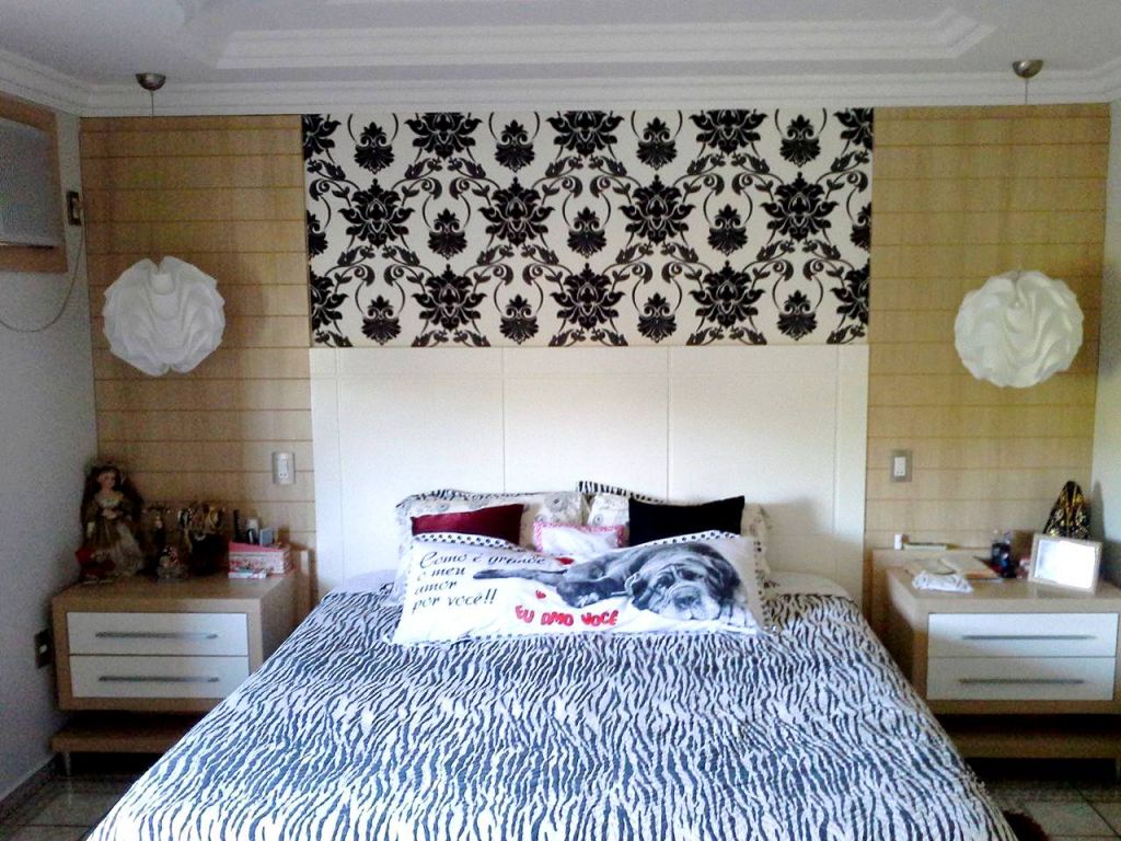 Cabeceira confeccionada em MDF BP Branco com painéis lateral em Carvalho e criados suspensos.
