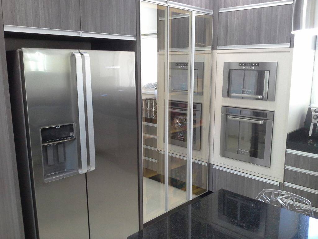 Confeccionada em MDF Roble Gris com puxadores grap, Granito preto São Gabriel em 45° e com portas de alumínio com vidro Reflecta Bronze.