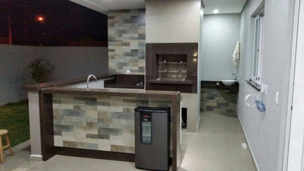 Edícula com bancada e boca de churrasqueira, confeccionada em Café Imperial com acabamento em 45°.