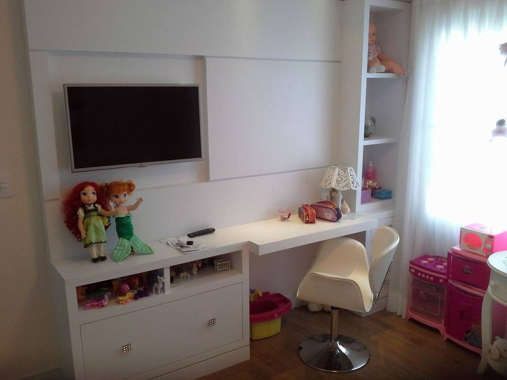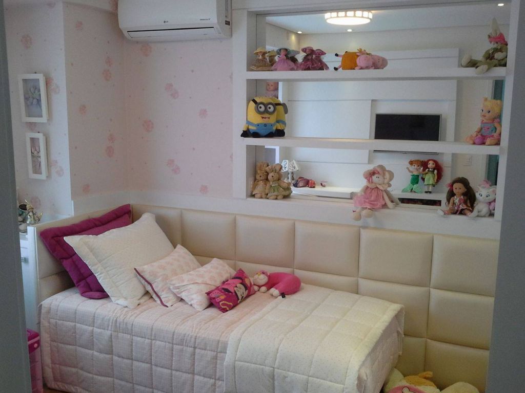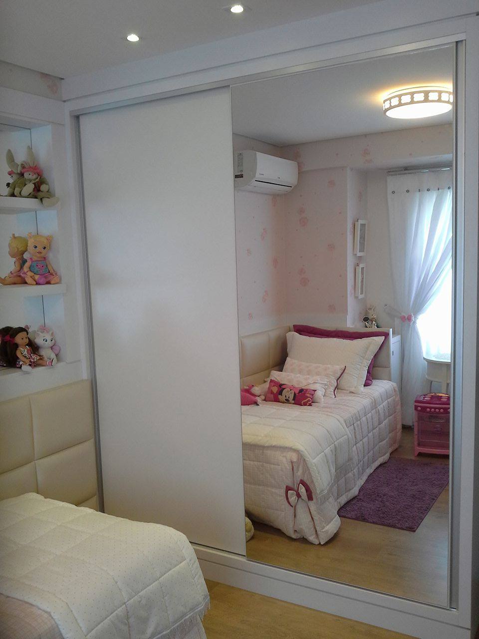 Quarto para crianças confeccionado em MDF BP branco com puxadores perfil em aluminio nos ármarios, porta de espelho e cabeceira estofadas.
